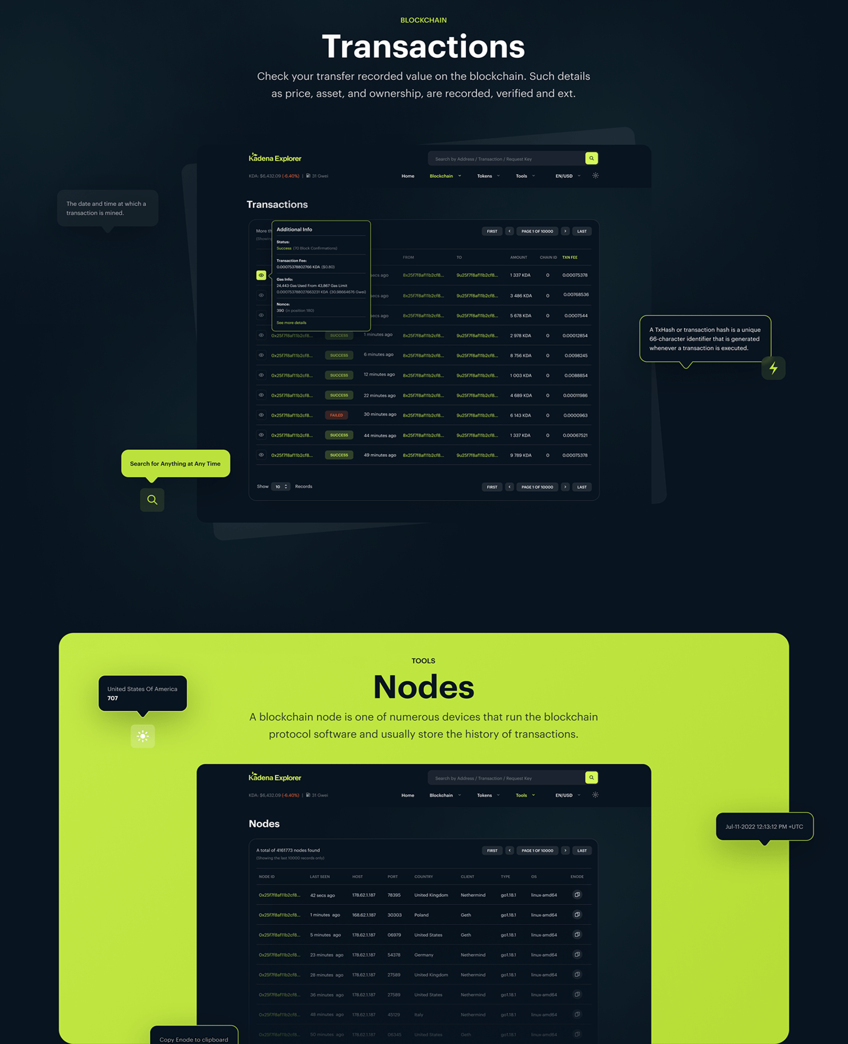 Kadena Explorer is a blockchain explorer that will allow youto search and explore data about recently mined blocks orrecently carried out transactions on a blockchain.